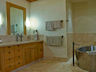 The first master suite is on this level. It is complete with king bed, gas fireplace, flat screen TV, huge closet area and its own washer/dryer. The en suite bathroom has a long vanity with double sinks and a steam shower large enough for two, with two rain shower heads. Sliding doors open to reveal a deck with beautiful views.