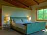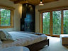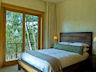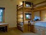 On the lower level, two flights down is the second master suite with a king bed and gas fireplace. It too, has sliding doors that open onto a deck. In summer, the Aspen trees offer privacy; in winter, the views will be exposed. The en suite bathroom is a replica of the one in the other master suite. The bunk room has four twins and one full bed. The bathroom has a large tub for soaking and a rain shower head. To accommodate all the guests in the bunk room, there is a half-bath as well.